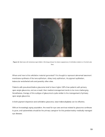 Figure 30. Best seen with pharmacologic dilation, this image shows the classic appearance of exfoliative material on the lenticular